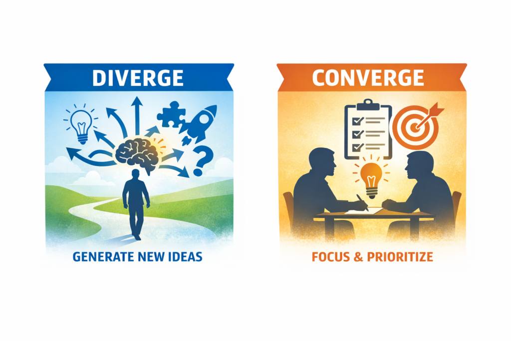 • Diverge to expand thinking, challenge assumptions, and generate novel perspectives.