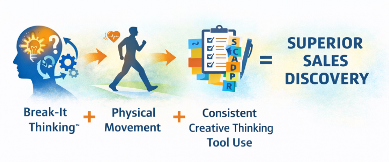 Using divergent thinking tools such as Excursions, Assumption Reversal, and SCAMPER, sellers move beyond obvious questions into hypothesis-driven dialogue. Discovery shifts from “Tell me more” to “What if this is also true?”